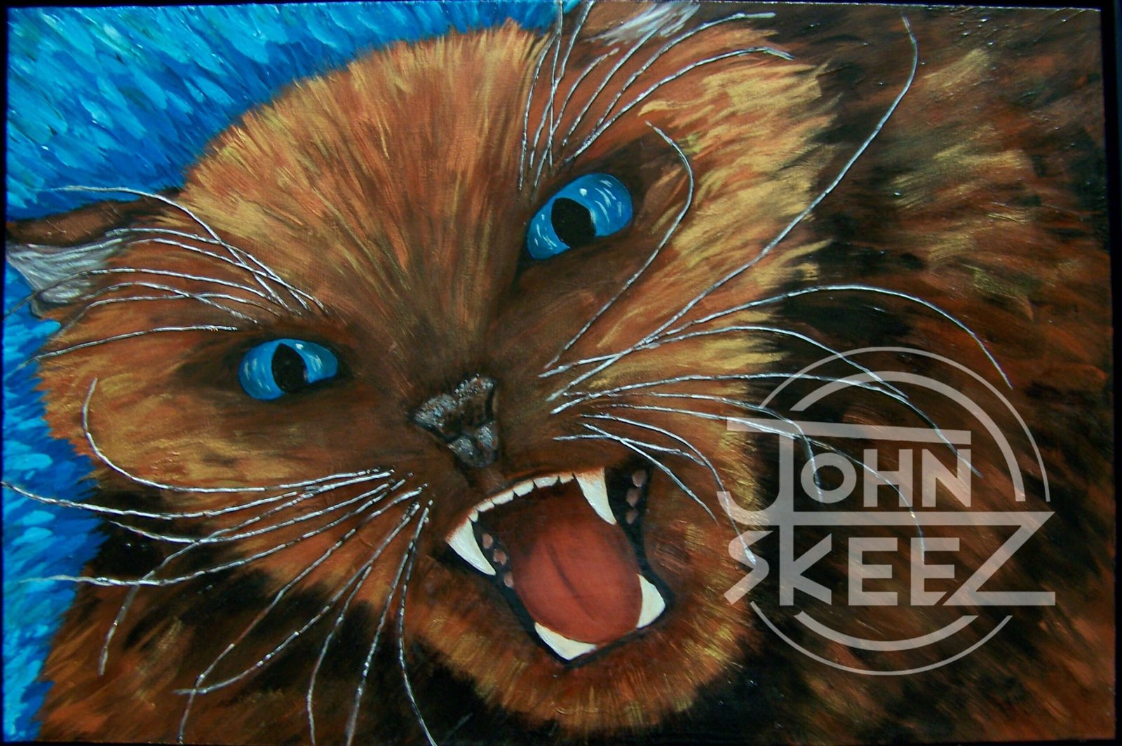 Emotional Cat Exquisitely Rendered in Acrylic on Canvas, set in a Navy-Blue “Floating” Wood Frame, created by John Skeez in 2012. Dimensions: 37″ × 26″.