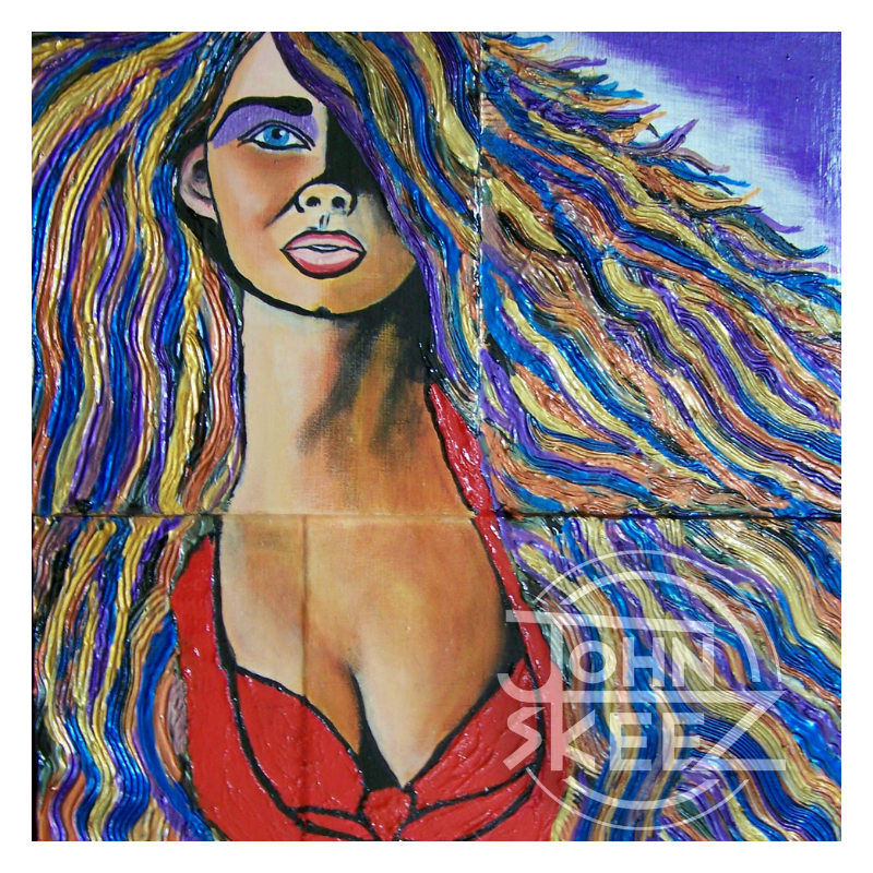 A Canvas and Artist’s Panel Collage Featuring Rich Acrylic Painting and set in a Dark-Red Frame, created by John Skeez in 2013. Dimensions: 21.5″×26.0″.
