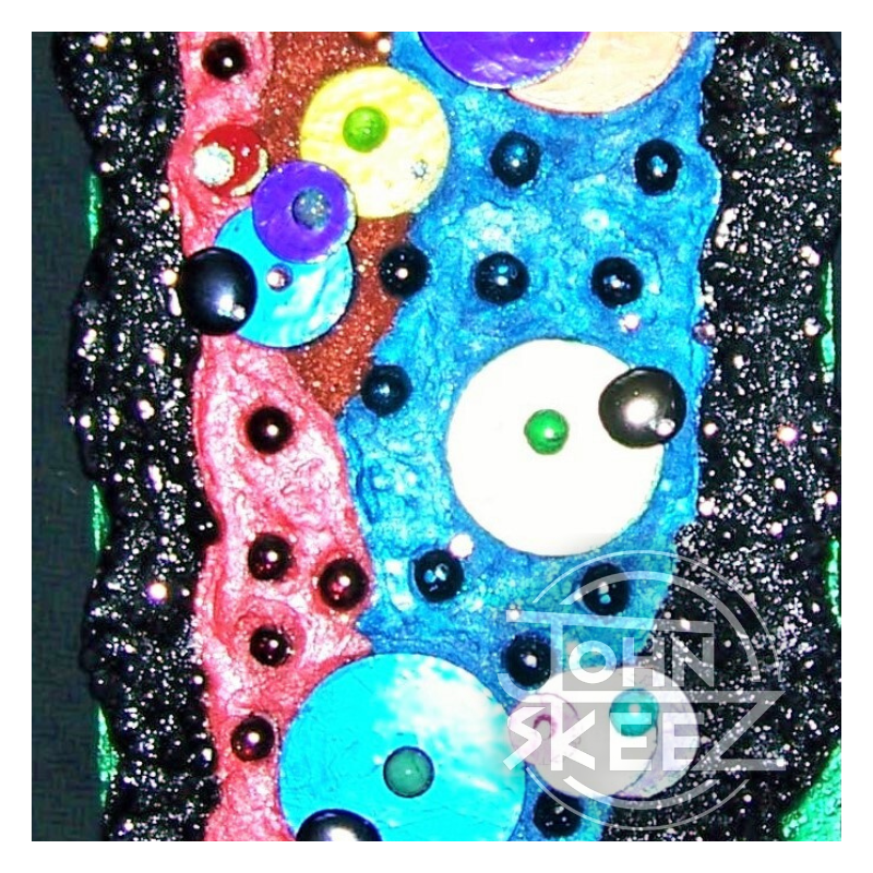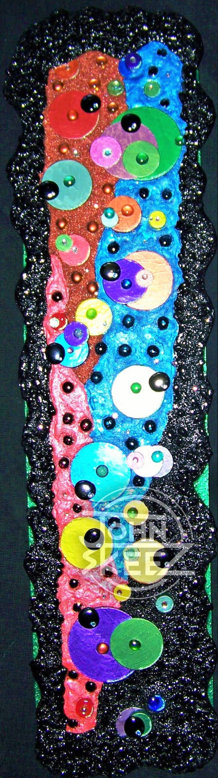 Asymmetry Meets Geometry in this Mixed Media Art Construct which is set on a Rounded Rectangle of Acrylic-Painted Wood, not requiring a frame, created by John Skeez in 2014. Dimensions: 12″×50″.