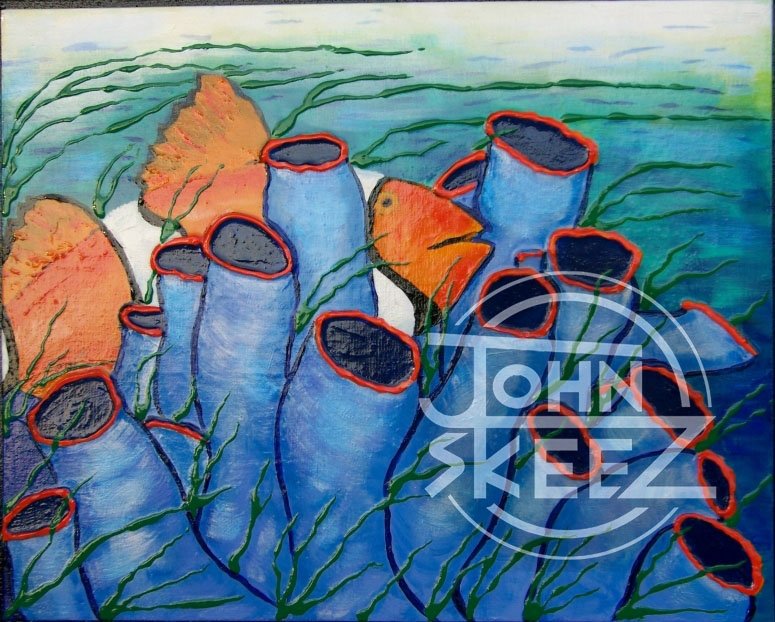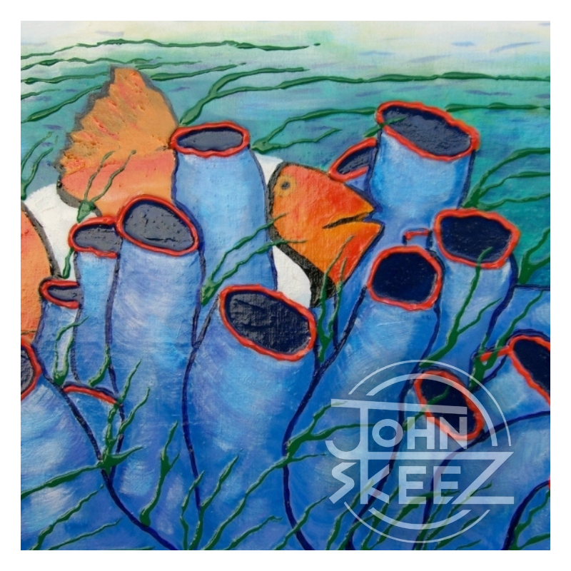 Clownfish Amongst Anemone Tentacles, rendered in Acrylic Paint on an Artist’s Panel, set in a Black “Floating” Frame, created by John Skeez in 2011. Dimensions: 22″×18″.