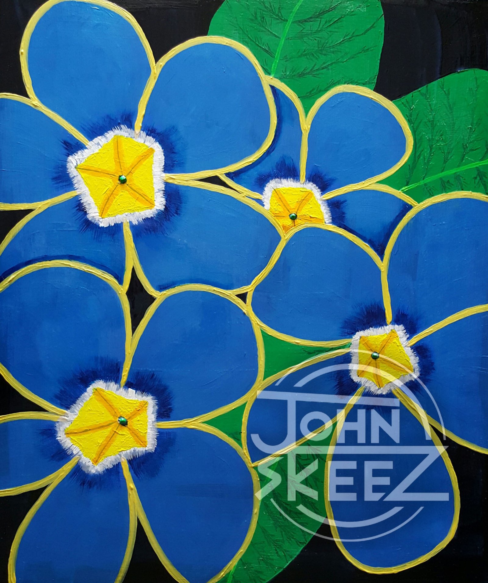 Beautiful High-Contrast Floral Painting rendered in Acrylic on Wood Panel, set in a purchased composite frame, created by John Skeez in 2015. Dimensions: 20″×38″.