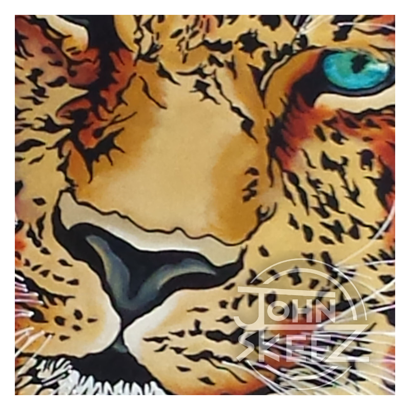 Gorgeous Leopard interpretation masterfully rendered in Acrylic Paint on Canvas, set in a Blue “Floating” Wood Frame, created by John Skeez in 2015. Dimensions: 25.90″×37.75″.