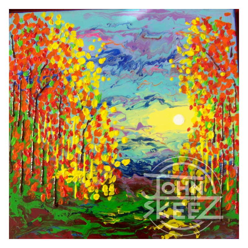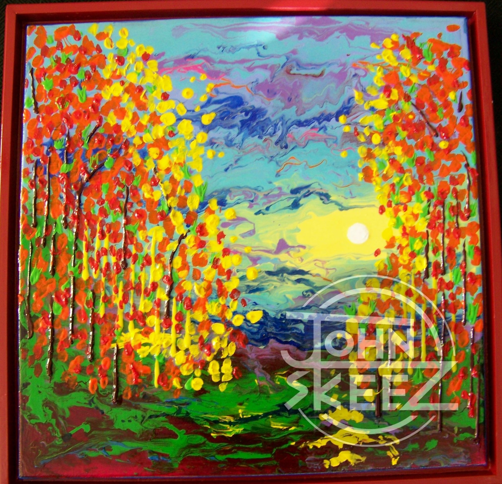 Award-Winning Abstract Acrylic Painting on Canvas, set in a Red “Floating” Wood Frame, created by John Skeez in 2011. Dimensions: 22″×22″. Second Place Award, Abstract Art Contest 2014, Hemet Valley Art Association.