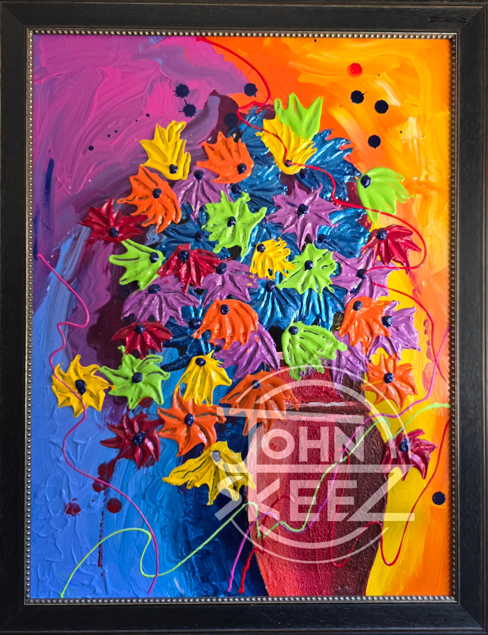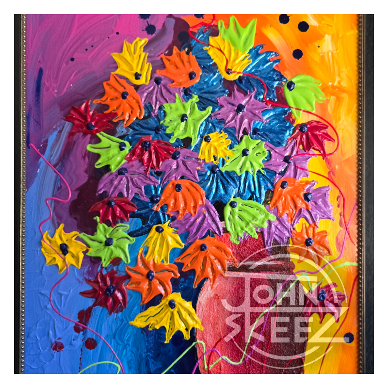 Outstanding Abstract Floral Painting rendered in Acrylic on an Artist’s Panel, set in a purchased frame, created by John Skeez in 2015. Dimensions: 21.4″×27.0″.