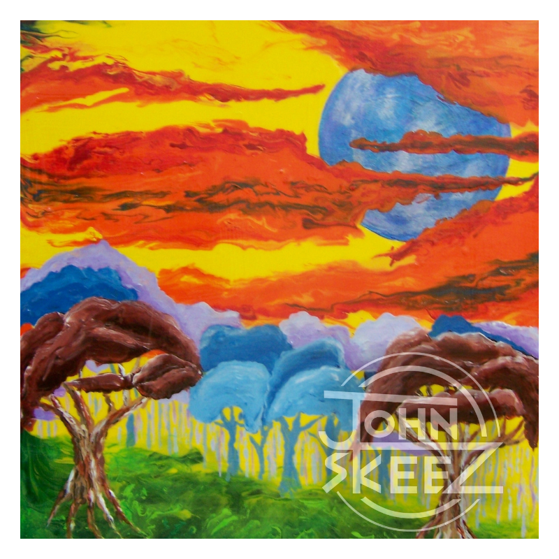 Award-Winning Abstract Landscape rendered in Acrylic Paint on Canvas, set in a Blue-Painted “Floating” Wood Frame, created by John Skeez in 2012. Dimensions: 22″×26″. Second Place Award, Modern Art Contest, Fine Art 2015, Hemet Valley Art Association.